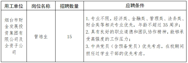 备注:市外首次来烟就业的35周岁以下(特别优秀的年龄可适当放宽)非应届毕业生,如有应聘意向,可先通过管培生岗位应聘,如符合烟台市人才引进政策,且顺利通过集团招聘考核,将根据应聘人员工作履历情况,结合集团实际用工需求,主要分配到投资管理、融资租赁、保理、综合文秘、运营管理等工作岗位。