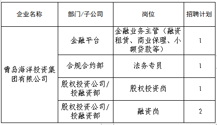为满足集团业务发展需要,青岛海洋投资集团有限公司现面向社会公开招聘工作人员5名,具体招聘公告如下: