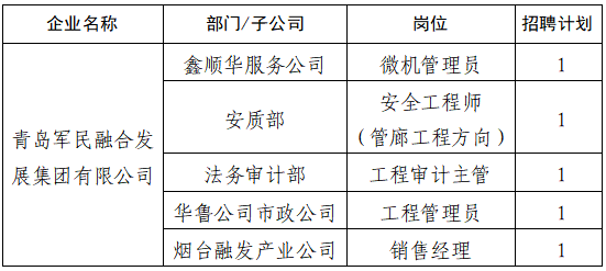 为满足集团业务发展需要,青岛军民融合发展集团有限公司现面向社会公开招聘工作人员5名,具体招聘公告如下:
